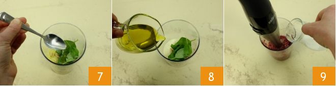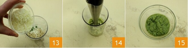 a ricota salgada e o Tilsit ralados 13, uma pitada de sal e bata tudo com o mixer de imersão 14, depois coloque o pesto obtido em uma tigelinha 15.