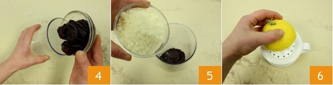 Depois transfira-as para um mixer com lâminas 4, adicione o queijo ralado 5; depois esprema o suco de limão 6, coe-o