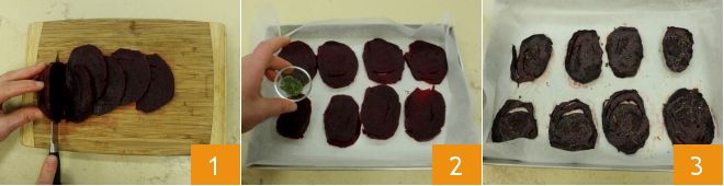 Para preparar a massa aos três pestos, comece pelo pesto de beterraba: descasque as beterrabas, depois corte-as em fatias de aproximadamente meio centímetro de espessura 1. Forre uma assadeira com papel manteiga e distribua as fatias de beterraba de modo que não se sobreponham. Salpique com sal a gosto e o tomilho picado 2, regue com um fio de azeite e asse em forno pré-aquecido a 200°C por 30-35 minutos (se forno ventilado, a 180°C por cerca de 25-30 minutos). Após o cozimento, deixe as beterrabas esfriarem 3.