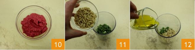 Transfira o pesto obtido para uma tigelinha 10. Continue a preparação com o pesto de manjerona: retire as folhas dos ramos de manjerona e coloque-as em um recipiente alto para bater junto com os pinhões 11; adicione o azeite 12,
