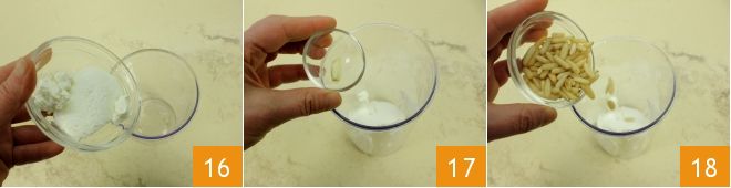 Por fim, passe para o pesto de queijos: no recipiente alto, coloque a ricota fresca 16, depois adicione o meio dente de alho 17, os pinhões 18,