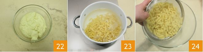 até obter uma mistura homogênea 22. Em uma panela, leve a água para ferver e cozinhe a massa al dente 23, depois escorra, reservando um pouco da água do cozimento, e coloque em uma tigela 24.