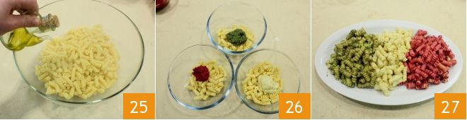 Tempere com um fio de azeite 25 e divida em três tigelas para temperar com os três pestos diferentes 26 (se necessário, adicione um pouco da água do cozimento para deixar a massa mais cremosa). Desta forma, você trará à mesa a massa aos três pestos em um prato tricolor para degustar todos 27!