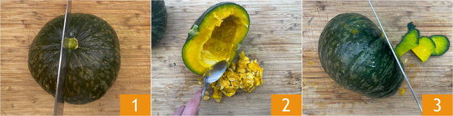 Para preparar a massa de abóbora e gorgonzola, primeiramente pegue a abóbora, corte-a ao meio 1 e retire todas as sementes com a ajuda de uma colher 2. Depois retire a casca 3.