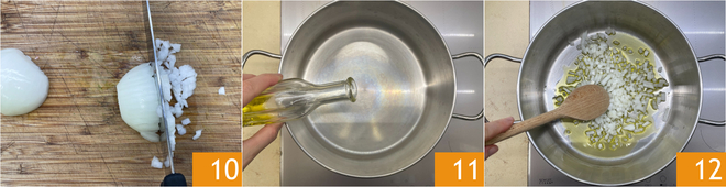 Descasque e pique uma cebola bem fininha 10. Em uma panela grande, coloque bastante óleo 11 e a cebola. Refogue em fogo médio 12.