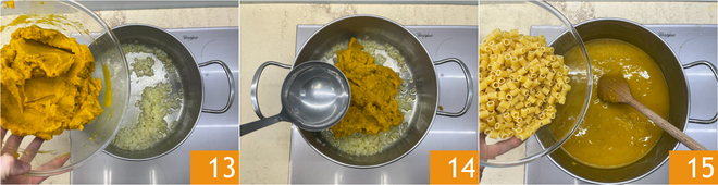 Adicione a abóbora 13 e duas conchas de água 14. Adicione os ditalini 15 e cozinhe até ficar pronto.