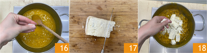Acrescente água sempre que necessário e adicione sal durante o cozimento 16. Enquanto isso, corte o gorgonzola em cubos 17 e adicione na panela com o fogo desligado junto com o Parmigiano Reggiano ralado 18.