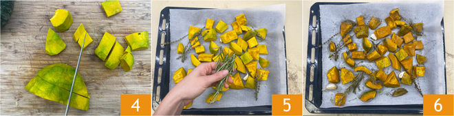Corte a abóbora em cubos grandes 4. Transfira-a para uma assadeira. Adicione sal, alho, tomilho, alecrim, louro e um fio de azeite 5. Asse no forno pré-aquecido a 180° por cerca de 30 minutos 6.