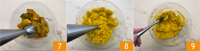 Depois que a abóbora estiver assada, retire os aromáticos e bata bem 7 com um mixer de mão 8 até obter um creme 9.
