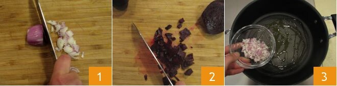 Para preparar a massa com beterraba e pecorino, primeiro limpe e pique com a faca o échalote 1. Corte as beterrabas em fatias e depois em cubos 2. Coloque no fogo uma panela cheia de água salgada que será usada para cozinhar a massa. Despeje um fio de óleo em uma panela, adicione o échalote picado 3.