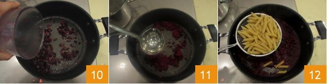 que adicionará ao tempero na caçarola 10. Despeje uma concha de água quente sobre o tempero 11, salgue e continue cozinhando o tempero por mais alguns minutos em fogo alto. Enquanto isso, cozinhe a massa, deixando-a um pouco crua, cerca de três minutos (siga as instruções de cozimento na embalagem). Escorra a massa diretamente na caçarola com o tempero 12.