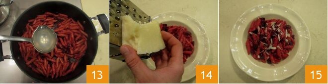 adicione uma concha de água da massa 13 e misture tudo em fogo baixo até terminar de cozinhar. Sirva sua massa bem quente, tempere com pimenta-do-reino e com uma raspagem de pecorino romano em lascas grossas (14-15).