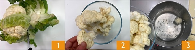 Para preparar a massa com brócolis arriminati, primeiro limpe a couve-flor removendo a base e as folhas 1, depois separe os floretes 2. Leve uma panela com água salgada para ferver e escalde os floretes de couve-flor por 8-10 minutos 3.