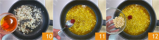Adicione o açafrão 10, o extrato de tomate 11 e os pinolis 12.