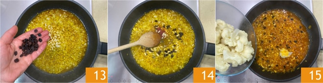 Adicione as passas bem escorridas 13, e misture tudo 14, depois adicione também as couves-flores 15.