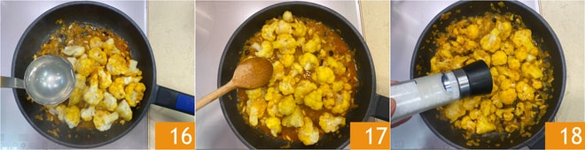 Adicione uma concha da água de cozimento 16 e cozinhe por cerca de 20 minutos em fogo médio-baixo, cuidando para quebrar os floretes com a concha para obter uma espécie de ragu 17. Ajuste o sal e a pimenta 18.