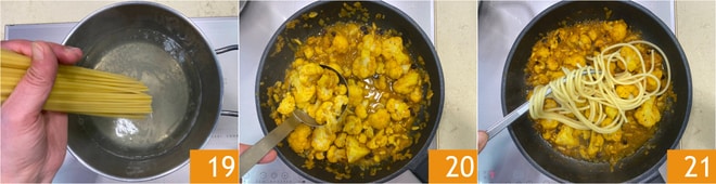 Enquanto isso, leve novamente a água de cozimento da couve-flor para ferver e cozinhe os bucatini 19. Após o tempo de cozimento do molho, retire uma parte para a apresentação do prato 20. Escorra a massa bem al dente e transfira-a para a frigideira 21.