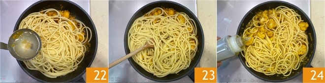 Adicione um pouco de água de cozimento 22 e finalize o cozimento dos bucatini junto com o molho 23. Finalmente, misture com um fio de azeite 24 e salteie tudo.