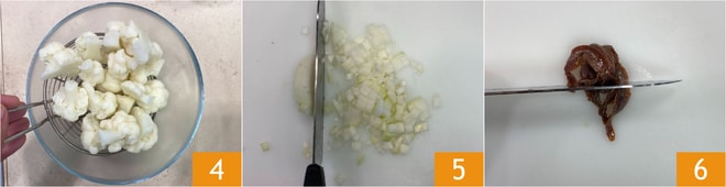 Escorra as couves-flores e reserve a água de cozimento 4. Enquanto isso, coloque as passas de molho e dissolva o açafrão em um pouco de água quente. Pique a cebola 5 e os filés de anchova 6.