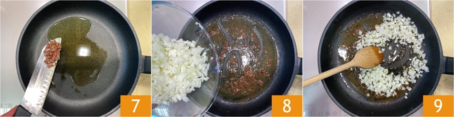 Aqueça um fio de azeite em uma frigideira grande, depois adicione as anchovas 7 e a cebola 8. Misture em fogo baixo para dissolver as anchovas 9.