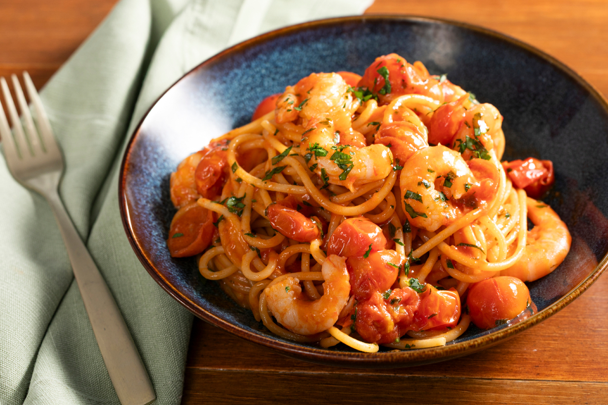 A massa com camarões é um prato principal tão simples quanto elegante: uma receita especial para impressionar, seja em um almoço em família ou em um jantar romântico! Os camarões, com sua carne doce e delicada, combinam perfeitamente com a polpa suculenta dos tomatinhos e a intensidade do fundo de cozimento obtido das cascas, que realça ao máximo o sabor do mar, proporcionando um aroma rico e envolvente. Fácil de preparar, mas com grande efeito, a massa com camarões tem tudo para ser incluída no seu repertório culinário.