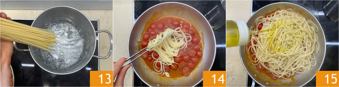 Enquanto isso, cozinhe a massa em bastante água salgada 13. Escorra-a al dente direto na frigideira 14, depois adicione uma concha da água do cozimento e um fio de azeite 15.