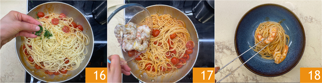 Aromatize com a salsinha picada 16 e misture bem. Por último, acrescente os camarões descascados 17 e continue cozinhando por mais alguns minutos. Sirva o espaguete com os camarões 18.