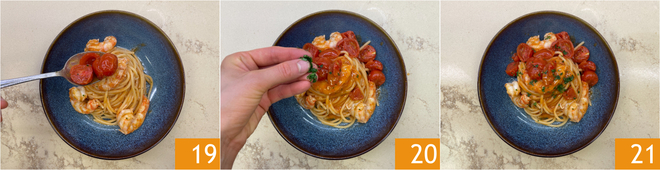 Adicione mais molho 19 e salsinha picada a gosto 20. Sua massa com camarões está pronta para ser servida 21!