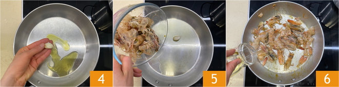 Em uma frigideira, deixe um fio de azeite aquecer com o alho por alguns minutos 4, depois acrescente as cabeças e as cascas dos camarões 5. Refogue bem, então adicione o vinho branco 6.