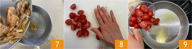 Quando toda a parte alcoólica evaporar, coe o fundo de cozimento através de uma peneira fina 7. Corte os tomatinhos ao meio 8 e coloque-os na mesma frigideira com um fio de azeite 9.