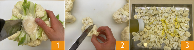Para preparar a massa com couve-flor e taleggio, primeiro limpe a couve-flor 1 e separe os floretes menores 2. Distribua os floretes em uma assadeira e tempere com o óleo 3.