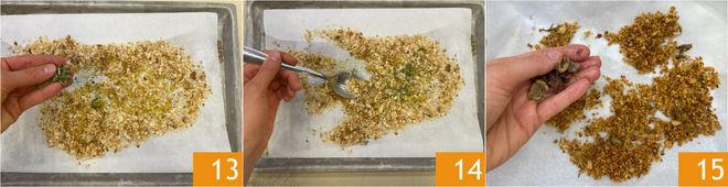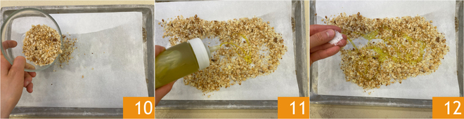 Agora dedique-se à farofa: distribua-a em uma assadeira forrada com papel manteiga 10, depois tempere com óleo 11 e sal 12.