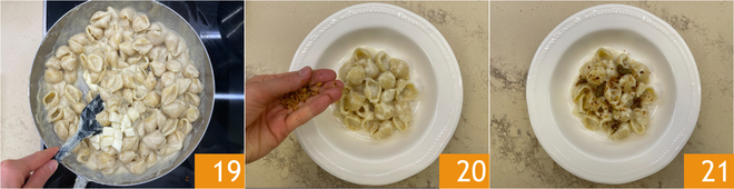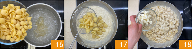 Agora cozinhe a massa na água fervente e salgada 16. Escorra a massa al dente e transfira-a para a frigideira com o creme de couve-flor 17, depois salteie brevemente para misturar, alongando com uma concha da água do cozimento. Desligue o fogo e adicione o taleggio em cubos 18.
