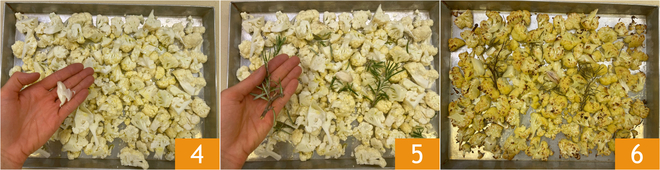 Adicione também o sal 4, um dente de alho 5 e o alecrim 6. Cozinhe em forno estático pré-aquecido a 200° por 25-30 minutos, ou até que a couve-flor esteja dourada 6. Enquanto isso, leve uma panela com água para ferver para cozinhar a massa.