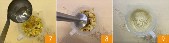 Transfira a couve-flor para um copo junto com uma concha de água quente 7, depois bata com um mixer de imersão 8 para obter um creme liso e homogêneo 9. Despeje o creme de couve-flor em uma frigideira grande e reserve.
