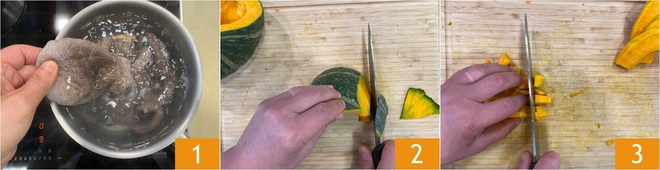 Para preparar a massa com creme de abóbora e polvo, primeiro coloque uma panela de água para ferver e mergulhe o polvo (já limpo) segurando pela cabeça, deixando-o escorregar delicadamente na panela 1. Cozinhe por cerca de 50 minutos até que esteja macio. Enquanto isso, limpe a abóbora: divida-a ao meio e remova os filamentos internos e a casca 2; você deve obter cerca de 400 g de polpa. Corte a polpa primeiro em fatias e depois em cubos pequenos e irregulares, para que cozinhe mais rapidamente 3.