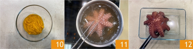 Você deve obter um creme liso e homogêneo 10. Enquanto isso, o polvo estará cozido 11, então coloque-o em uma tigela para esfriar um pouco 12.