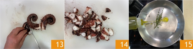 Transfira o polvo para uma tábua e separe os tentáculos do corpo 13. Corte todas as partes em pedaços de cerca de 2 cm, obtendo pedaços regulares 14. Em uma frigideira, adicione um fio de azeite com alho e tomilho 15.