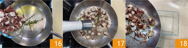 Quando estiverem quentes, adicione os pedaços de polvo 16, salgue 17 e deixe dourar até ficarem bem dourados. Quando estiverem prontos, transfira-os para um recipiente 18 e reserve. Coloque uma panela cheia de água salgada no fogo e leve para ferver.