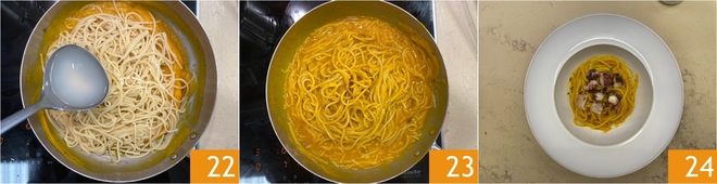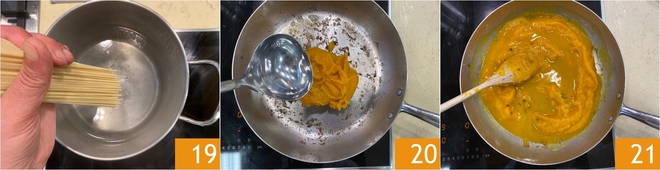 Cozinhe aqui os espaguetes al dente 19. Agora, coloque o creme de abóbora de volta na frigideira onde você dourou o polvo e dilua com uma concha da água do cozimento da massa 20 21.