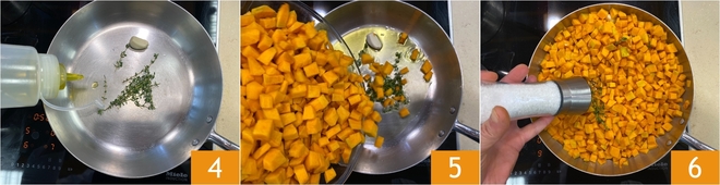 Em uma frigideira, coloque um fio de azeite com um dente de alho e alguns ramos de tomilho 4, deixe aromatizar e adicione a abóbora 5. Nesse ponto, salgue 6 e apimente.