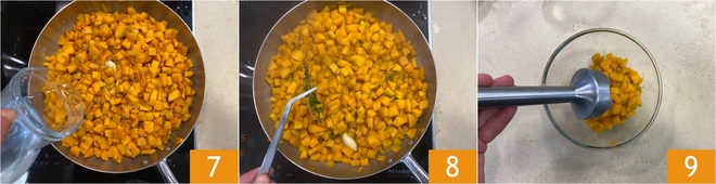 Misture e adicione um pouco de água quente para facilitar o cozimento 7. Após cerca de dez minutos, quando a polpa estiver macia, remova o alho e o tomilho 8 e transfira a abóbora para uma tigela. Bata-a com um mixer de imersão 9.