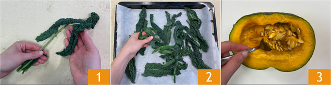 Para preparar a massa com creme de abóbora e taleggio, comece pela couve: separe as folhas dos talos 1, depois disponha-as em uma assadeira forrada com papel manteiga, espaçando-as ligeiramente entre si 2. Asse em forno pré-aquecido ventilado a 170° por 20 minutos. Enquanto isso, cuide da abóbora: limpe os sementes e os filamentos internos 3.