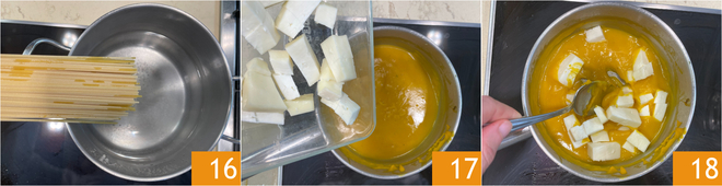 Agora cozinhe os espaguetes em água fervente com sal 16. Enquanto isso, aqueça o creme de abóbora em uma panela, depois adicione o taleggio em pedaços 17 e misture em fogo baixo para derretê-lo completamente 18.