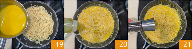 Escorra a massa um minuto antes do final do tempo de cozimento e transfira-a para uma frigideira grande com um pouco de água do cozimento, depois adicione o creme de abóbora e taleggio 19 e misture bem para incorporar. Finalmente, misture com um fio de azeite 20 e uma pitada de pimenta 21.