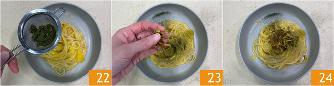 Emprate e decore com o pó de couve, ajudando-se com uma peneira 22, e o alho-poró frito 23. Sua massa com creme de abóbora e taleggio está pronta para ser servida 24!