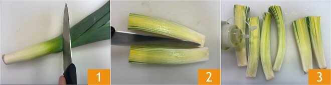Para preparar a massa com creme de alho-poró braseado, avelãs e funcho, a primeira coisa a fazer é limpar os alhos-poró: elimine a parte verde 1 e a base, depois divida-os ao meio no sentido do comprimento 2 e tempere com óleo 3.