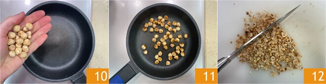 Enquanto isso, coloque as avelãs em uma frigideira já quente 10 e toste-as por alguns minutos, tomando cuidado para não queimá-las 11. Pique as avelãs grosseiramente com uma faca 12.