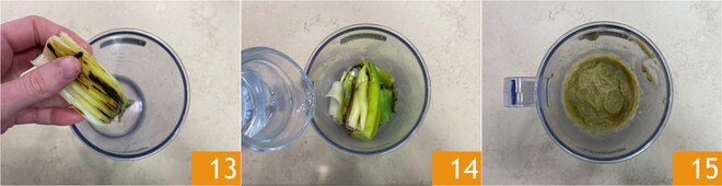 Retome os alhos-poró braseados e coloque-os em um copo 10, em seguida adicione um pouco de água 11 e misture com um mixer de imersão até obter um creme liso e homogêneo 12. Reserve.
