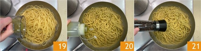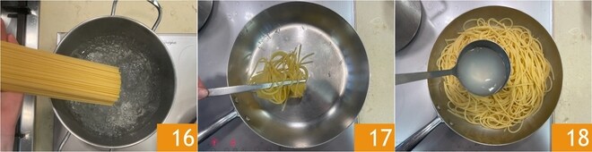 Cozinhe os espaguetes em abundante água fervente com sal 16. Escorra a massa 2 minutos antes do tempo de cozimento e transfira para uma frigideira 17, depois adicione uma concha da água do cozimento 18.
